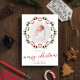 This design features a merry Christmas, one photo card with red and green, botanical foliage greenery, a brush script typography, a simple calligraphy, minimalist holly berries, with minimal pine cones, and a circle photo template holiday photo cards