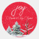 Cute Christmas stickers that you can customize. Lovely pine trees and maple tree covered in snow. Pretty snowflakes fall against a red background. Add your names and greeting.