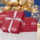 A red background, white text and a hand-drawn bow. Merry Christmas is written with a retro style font.