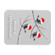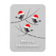 This Merry Christmas Magnet features illustration of three cute birds sitting on the tree branches covered by snow. The birds wear red Santa hats and enjoy gentle snowfall. Illustration is done in restricted grey tones to emphasize the joy of bright red colour of the hats. Great holiday decoration for gift to friends and family.