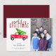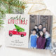 "Merry Christmas" decorative text in hand lettering and calligraphy style font with watercolor red vintage pickup truck with a Christmas tree on back illustration. Replace this 1 photo with your own family photo to personalize this card.