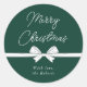 Add the finishing touch to your gift packaging this holiday season with these elegant green and white Christmas round stickers. Featuring handwritten style font that reads 'Merry Christmas', a hand drawn whimsical bow in white with your custom name underneath.