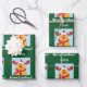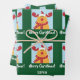 Modern Christmas gift wrap for kids, with Rudolph the Reindeer, the greeting "Merry Christmas" in stylish typography, and a personalized name. On a Xmas green background.