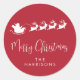 Fun seasonal red sticker for your Christmas holiday cards and correspondence featuring a white silhouette of reindeers flying Santa's sleigh through air, "Merry Christmas" in a stylish white script and your name in simple modern white typography.