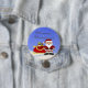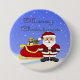 Merry Christmas Santa Round Button features a snow scene background with falling snow, a Happy Santa standing next to his sleigh full of toys. Decorative purple and blue text is Merry Christmas. Perfect gift for Christmas stocking stuffer.