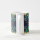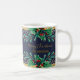 "Merry Christmas Script Navy Gold Red Watercolor Coffee Mug." "Merry Christmas" is in script calligraphy handwriting with your family name or message below. Watercolor hand painted holly leaves, foliage and berries are combined with gold glitter hand drawn greenery elements over a deep navy blue background. Art by internationally licensed artist, Audrey Jeanne Roberts, copyright.