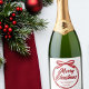 Chic, modern cursive script across a gorgeous red ribbon and bow reads MERRY CHRISTMAS in elegant cursive typography. A tied bow is super trendy for 2025 holiday party champagne bottle labels. Personalize with your family or business name in the centre.