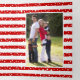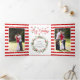 Red Merry Christmas script typography and wreath photo Holiday Card. This festive design displays a Christmas wrearth as a frame for your photo and the text "Merry Christmas" in modern script typography in red on the cover. More photos on the inside first and last panel while the middle inside holds your wishes. A pattern made of red and white stripes with snow covers the back and forms frames for the photos.