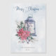 Lovely watercolor style modern "Merry Christmas" greeting in custom blue calligraphy script graphic, artistic lantern, spray of poinsettias, greenery and rustic twigs on pale blue watercolor wash background with editable text fields.