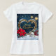Celebrate the festive season with this charming Christmas T-shirt featuring a beautiful and intricate holiday graphic. The centerpiece of the design is a stunning, ornate golden heart frame, lightly dusted with sparkling snow, which beautifully encircles elegant gold script wishing "Merry Christmas." This enchanting winter scene is richly decorated with classic holiday elements, including a vibrant red poinsettia, deep red berries, a shiny silver ornament, and pine cones, all nestled in a bed of glistening snow. Set against a deep, starry blue night sky, this comfortable, classic-fit T-shirt is the perfect way to share the warmth and joy of Christmas, making it an ideal choice for holiday parties, family gatherings, or a thoughtful seasonal gift.