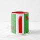 This coffee or tea mug has a silly skeleton holding snowflake covered red and green ornaments up to his eyes wearing a red Santa hat in between the red text Merry Christmas on a green background with tiny golden flecks.