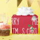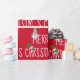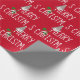White Merry Christmas font with snowman and pine tree with hat on red background.