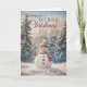 A beautiful festive Holiday Season snowman Christmas card comprising of a winter snowy scene with a smiling snowman wearing a heat hat and scarf surround by snow covered fir trees All text can be customized , then personalize with name (s) and inside message