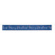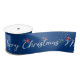 White Merry Christmas greeting text with red hat, green tree, and white sparkles on a blue background.