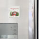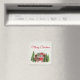 Merry Christmas magnet with a cute and whimsical Christmas theme. A cozy trailer decorated for Christmas set among some pine trees.
