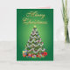 A Golden Merry Christmas above a beautifully decorated Christmas tree with presents on a dark green background. Inside the Christmas tree is repeated on the left side and a Holiday Candle graphic is on the right side. You can change or add text as you like on the inside of the card.