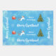 Modern Christmas giftwrap with the words "Merry Christmas" in stylish typography, snowflakes, an illustration of a unicorn (with a mane and tail with red and golden glitter) pulling Santa in his sleigh, and a Xmas tree. On a blue background with snowflakes. Note that you can personalize the smaller greeting with the name of a kid.