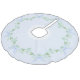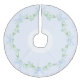 This chic tree skirt design features a grandmillennial Christmas design with a blue and green holly swag with blue bow with a light blue background.
