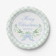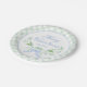 This chic paper plate design features a grandmillennial Christmas design with a blue and green holly swag with blue bow with text that says "Merry Christmas to You." The background has decorative blue and green trellis pattern.