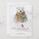 This design is filled with colour and the joyous of the Christmas season, featuring a polar bear with red berries and holly accents. Elegant script typography featuring Red Robin. Vintage vibe, winter wonderland holiday card design.
