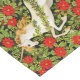 Painting of Christmas Unicorn with red poinsettia flowers, holly twigs and green leaves on a dark background.