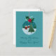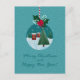 Festive teal holiday card featuring a glass ornament with a snowy village and Christmas tree, topped with holly and a red bow. Snowy background and hand-lettered greeting. Personalize the names, year, and inside message—perfect for family, friends, teachers, and coworkers.