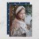 Cute holiday photo card with "Merry Christmas" featured at the bottom of the card in a white handwritten script. Personalize the whimsical Christmas card with your vertical photo and family name. The card reverses to a navy and white snowflake pattern.