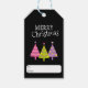 A pretty and whimsical Merry Christmas gift tag featuring pink, purple, and green Christmas trees on a black background.