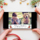 Merry Christmas photo holiday card featuring your photo, "Merry Christmas" in a contemporary script, your family name in simple modern typography and watercolor bouquets of poinsettia flowers and winter greenery.