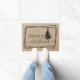 Merry Christmas with Ribbon Tree Doormat. Faux burlap canvas texture background.
