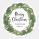 These trendy and stylish Christmas stickers feature a pretty, watercolor Christmas wreath with gold coloured star accents and lights, with modern script calligraphy that says "Merry Christmas" on a white background.