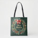 A festive Christmas tote bag featuring a traditional holiday wreath design with pinecones, holly berries, and a red bow on a deep green background. Thebag is ideal for carrying essentials during the holiday season, whether you're shopping for gifts, attending family gatherings or meeting friends for coffee. It also makes a stylish reusable alternative to paper gift bags. Personalize with a name for the finishing touch.