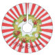 This beautiful Christmas tree skirt features festive design with customizable “Merry Christmas” text in dark red, green holiday wreath with gold ornaments on red and white sunburst pattern.