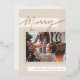 Modern and simple single Christmas photo card featuring hand-scripted foil script, "Merry", with minimalist color blocking details in warm neutral beige and cream white. Back features a classic vertical stripe pattern. Choose from gold foil, silver, foil or rose gold foil for a touch of luxury.