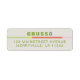 Coordinates with four photo festive merry bright holiday card design. This is a return address label with a bold family name and colourful line detail with light green, dark green, red, and soft pink.