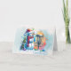 Personalized disc golf themed Christmas card. Cute watercolor cartoon snowman in Santa hat next to a disc golf basket in the snow next to a Christmas tree.