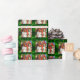 This product has a design with Merry Elves Wrapping a Present. This is a vintage design with the elves happily wrapping a large Christmas present. Adding to the effect is a modern combination with the green snowflake background.