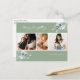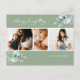 Merry Everything script. Watercolor arctic winter botanical arrangements, sage green photo collage holiday postcard. Card features three photos on front with multiple template text lines on back of card for your address, message, names & year.