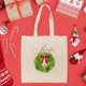 Rustic Christmas theme tote bag design featuring watercolor illustration of green pine leaves wreath with a red bow. The text says "Merry" in script font with a heart.