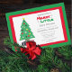 Christmas themed merry little baby shower invitation. Invite features red and green holiday theme with grey snowflakes, Christmas tree and presents.