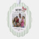 This paper Christmas ornament features space for 2 photos framed within a soft, light green striped border on the front and a rich red on the back. At the top, the phrase “MERRY memories” is prominently displayed, blending a bold, festive font with elegant calligraphy script. A red and green ribbon bow adds a cheerful holiday touch in the upper right corner. The design beautifully conveys warmth, connection, and celebration, making it a lovely holiday gift.