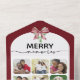 This folded all in one Christmas card features a joyful and heartwarming collage of family photos. At the top, the phrase “MERRY memories” is prominently displayed, blending a bold, festive font with elegant script. A red and green ribbon bow adds a cheerful holiday touch. The card offers space for seven family photos, 6 smaller square photos and one larger horizontal. The design beautifully conveys warmth, connection, and celebration, making it a lovely holiday greeting.