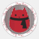 A cute red owl with black scarf on a red and black stripe background with the words "Merry Owlmas" in a circle. Sweet sticker to decorate your envelopes, packages, and gifts.