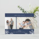 Elegant and modern Hanukkah photo card features two favourite photos aligned side by side, with "Joyous Hanukkah" at the top in white italic and block typography. Personalize with your custom greeting and name at the bottom, accented by four white snowflake illustrations. A navy blue background adds classic elegance to your holiday greeting. Card reverses to a snowfall pattern in chic grey.