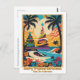 A gorgeous tropical Christmas postcard with a vibrant, colourful image of palm trees, a beach, flowers and two Christmas trees!