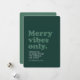 Merry vibes only this holiday season! Send a retro-style holiday card with this fun and funky design. The throwback type reads "merry vibes only" in green on a darker vintage green and it also has room for a custom message, name and year. The coordinating back has a distressed texture to complete the vintage look.