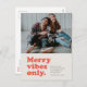 Merry vibes only this holiday season! Send a fun retro-style holiday card with this one-photo design. The throwback type reads "merry vibes only" and it also has room for a custom message, name and year. The back features room for a custom message but can be left blank so you can write a more personal message.
