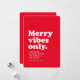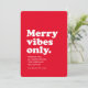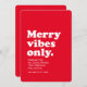 Merry vibes only this holiday season! Send a retro-style holiday card with this fun and funky design. The throwback type reads "merry vibes only" and it also has room for a custom message, name and year. The coordinating festive red back has a distressed texture to complete the vintage look.