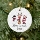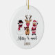 This funny and cute Christmas ornament has a snowman, reindeer and Santa Claus wearing masks. There are buffalo plaid patterns, and lovely red, white, black, and tan colours. You can customize it with the year.