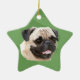 This cute Pug portrait is on an ornament with a Christmas green background. You can add text or images to the back as well.